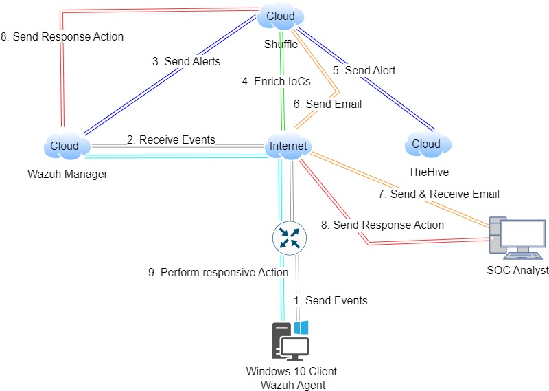This project outlines a comprehensive approach to building a Security Operations Center (SOC) ecosystem for efficient threat detection and response. Utilizing Wazuh, Shuffle, and TheHive, the workflow seamlessly integrates various components to automate security incident handling. From event collection on Windows 10 PCs to response orchestration via email communication, each component plays a crucial role in streamlining the SOC workflow. By automating responses to security threats, organizations can bolster their cybersecurity posture, reduce manual intervention, and enhance overall incident response capabilities.